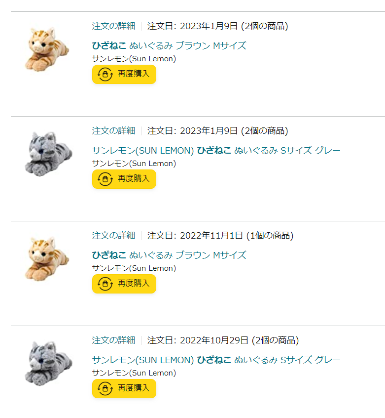 毎日一緒に寝ている、猫のぬいぐるみ「ひざねこ」。実家で見せたら案の定買いました。