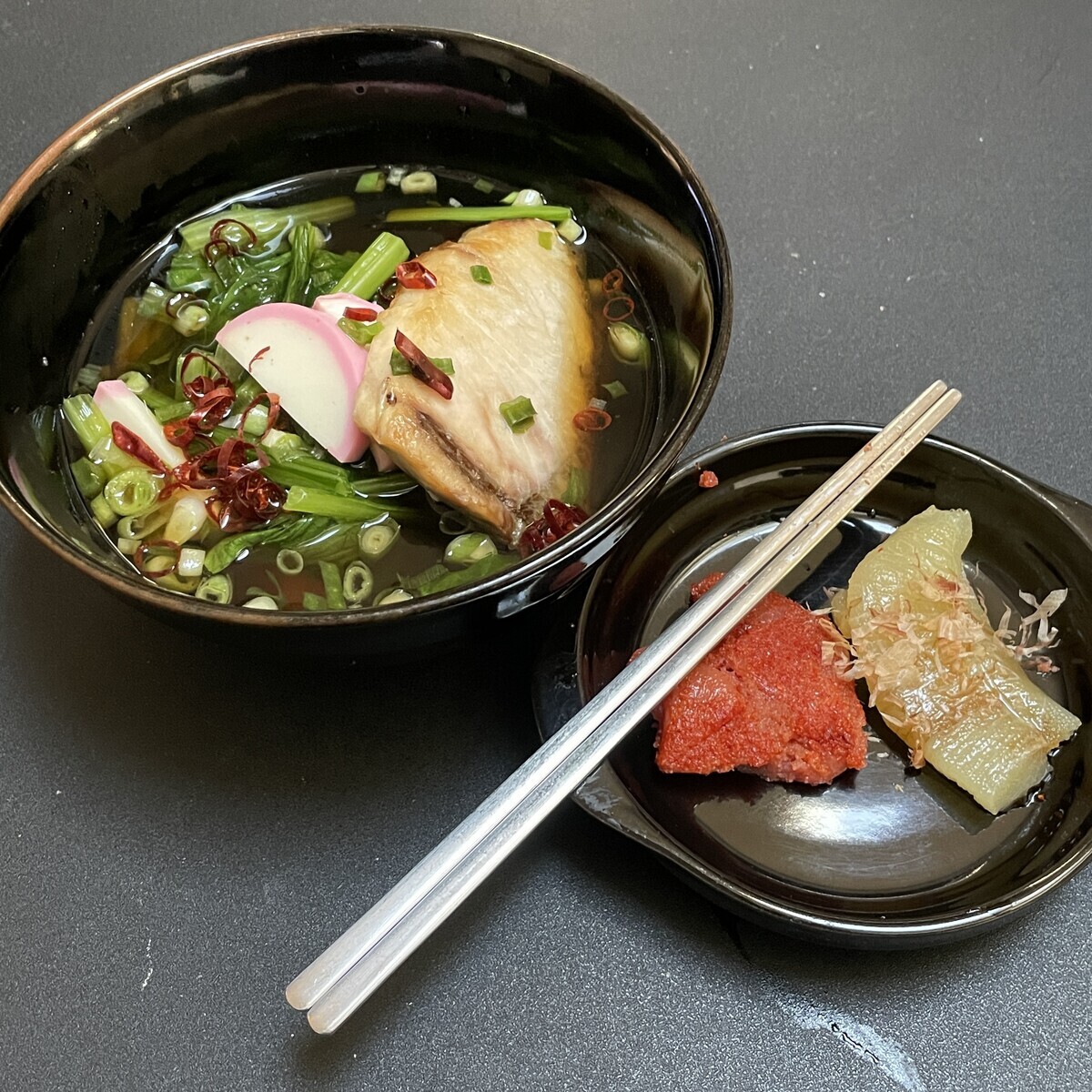 茹でた小松菜(正月菜・もち菜)と焼いたブリは後乗せ