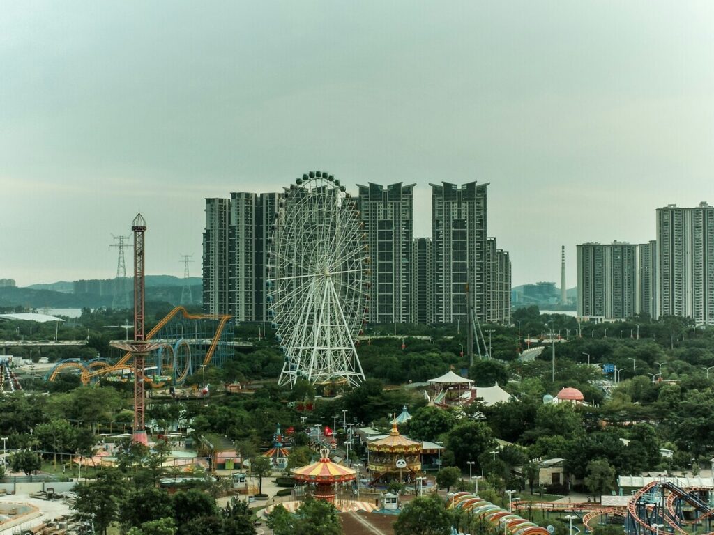 外を見ると、巨大なマンション群とアミューズメントパーク。